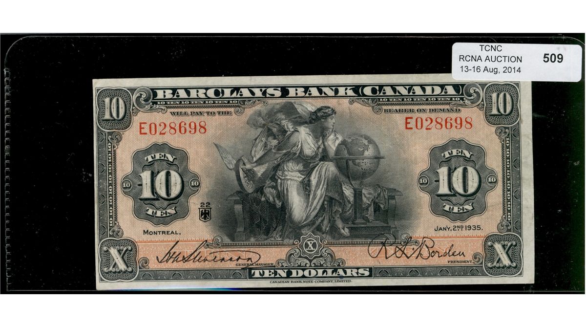 Barclay's Bank of Canada; 1935 $10 #E028698, CH-30-12-06. A nice VF issue with light press.