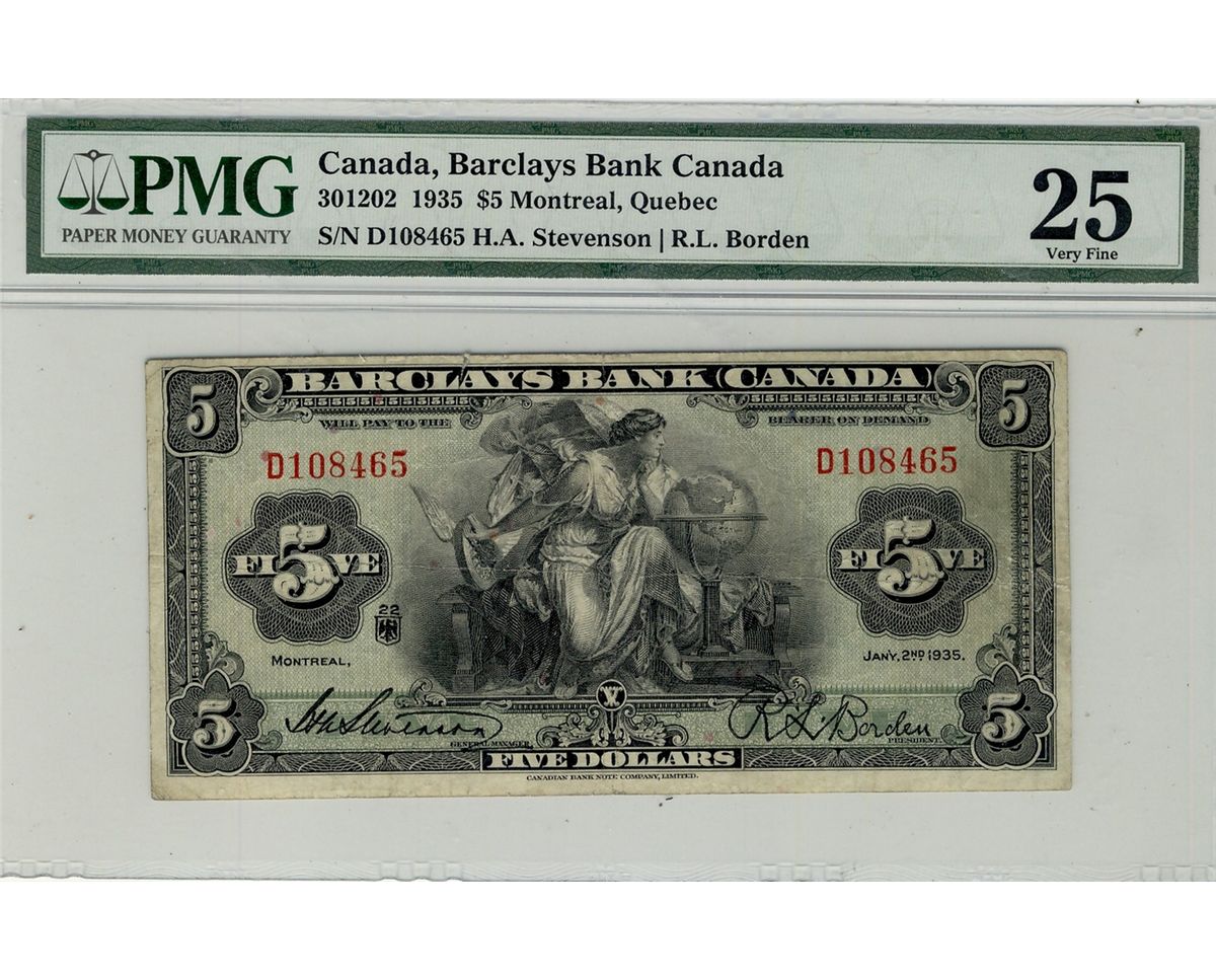 Barclay's Bank of Canada 1935 $5 #D108465 CH-30-12-02 PMG VF25. Minor edge nick.. A nice and clean example.