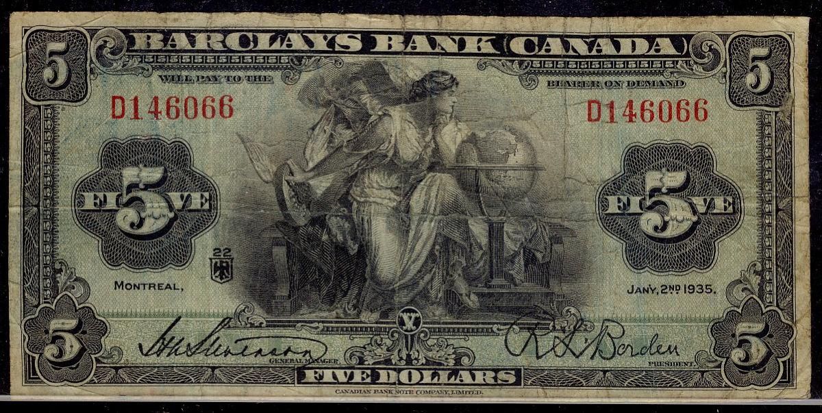 Barclay's Bank of Canada 1935 $5 #D146066 CH-30-12-02. Nice VG-F issue.
