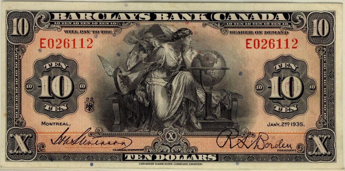 Barclays Bank Canada 1935 $10 #E026112 CH-30-12-06 PMG CH AU58. Rare in this condition.