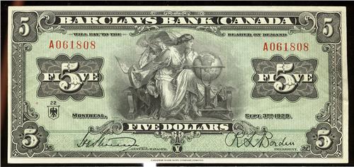 Barclays Bank of Canada 1929 $5 30-10-02b A061808 Original AU-UNC! Well centered with vibrant colours. Candidate for the "finest known"! Very rare and seldom seen in any grade. Worth a premium bid!
