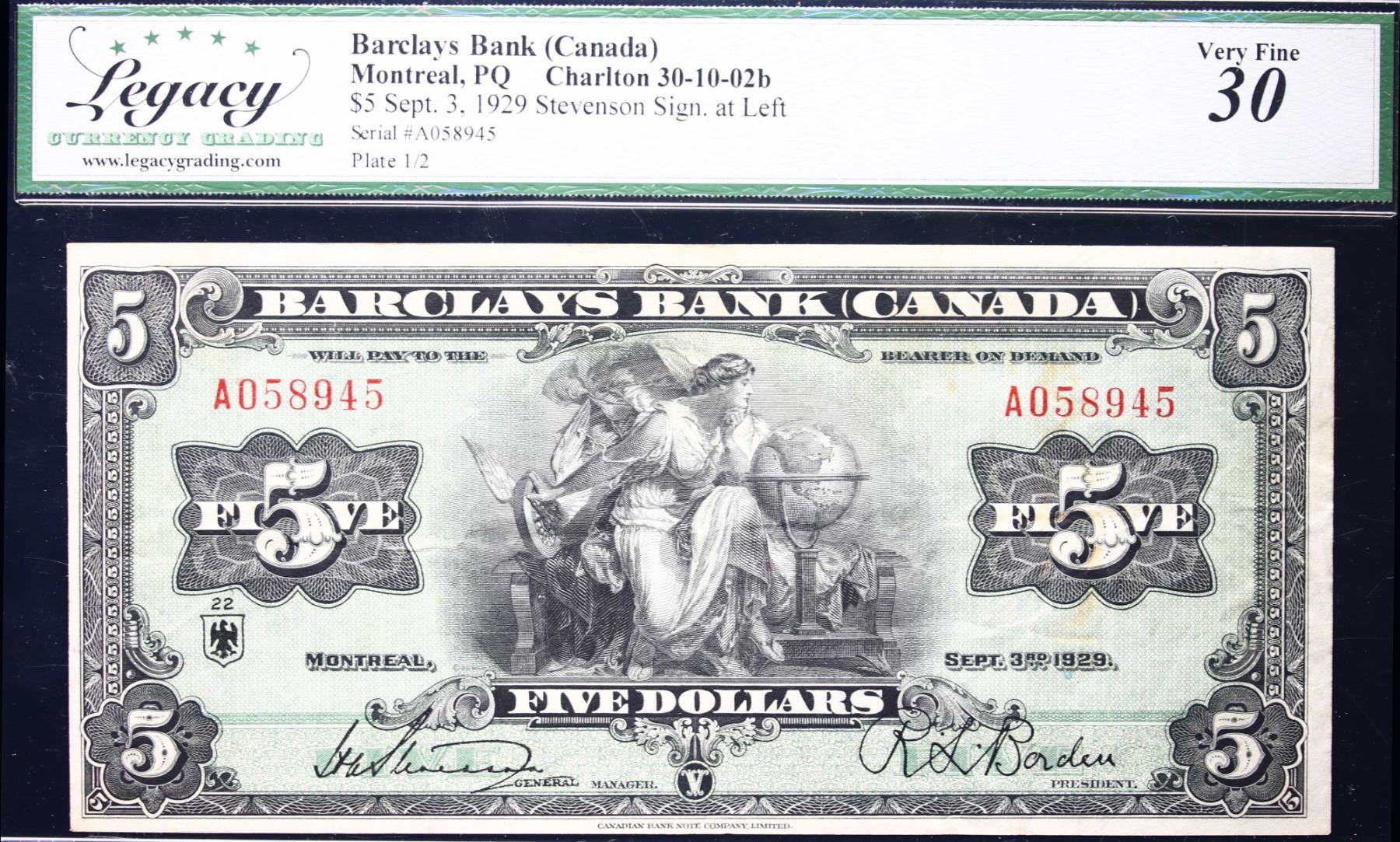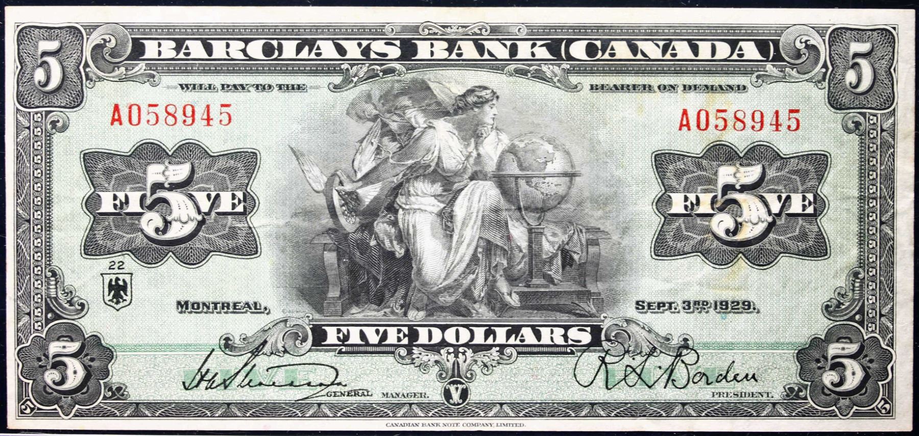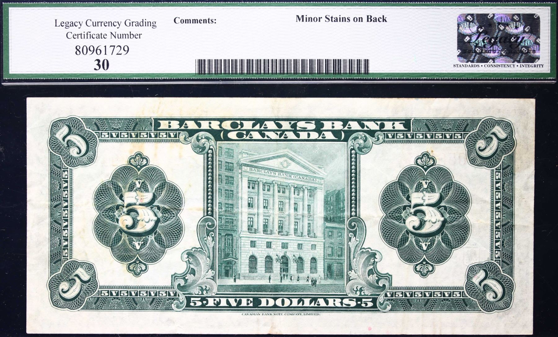 Barclays Bank of Canada 1929 $5 CH-30-10-02B #A058945 LCG LCG Choice Very Fine-30. A superior example with great colours. Seldom offered.