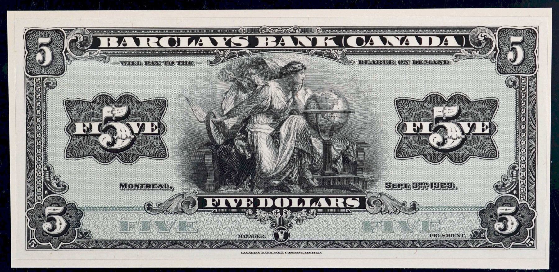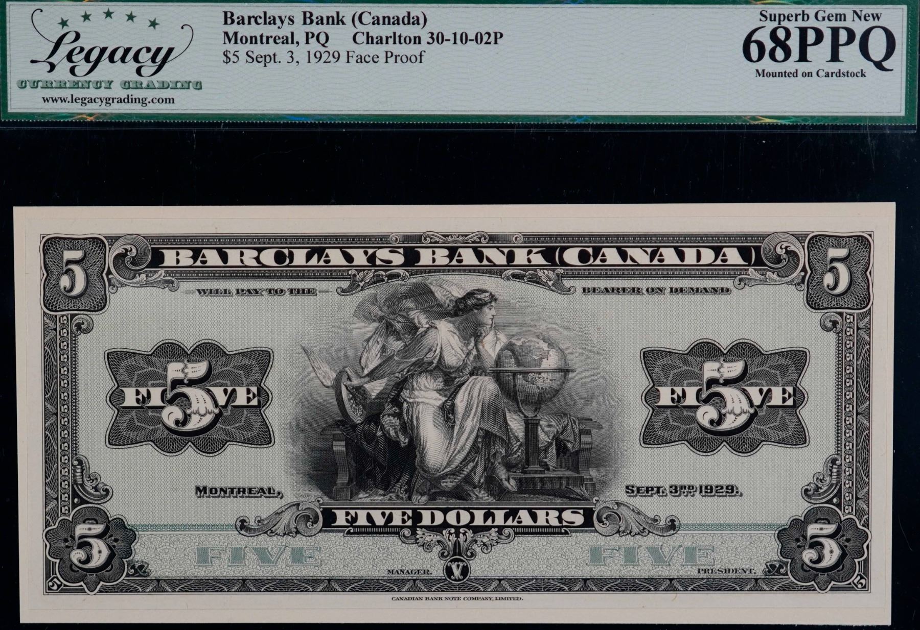 Barclays Bank of Canada; 1929 $5 CH-30-10-02P, Legacy Currency Grading Superb Gem Uncirculated-68PPQ.