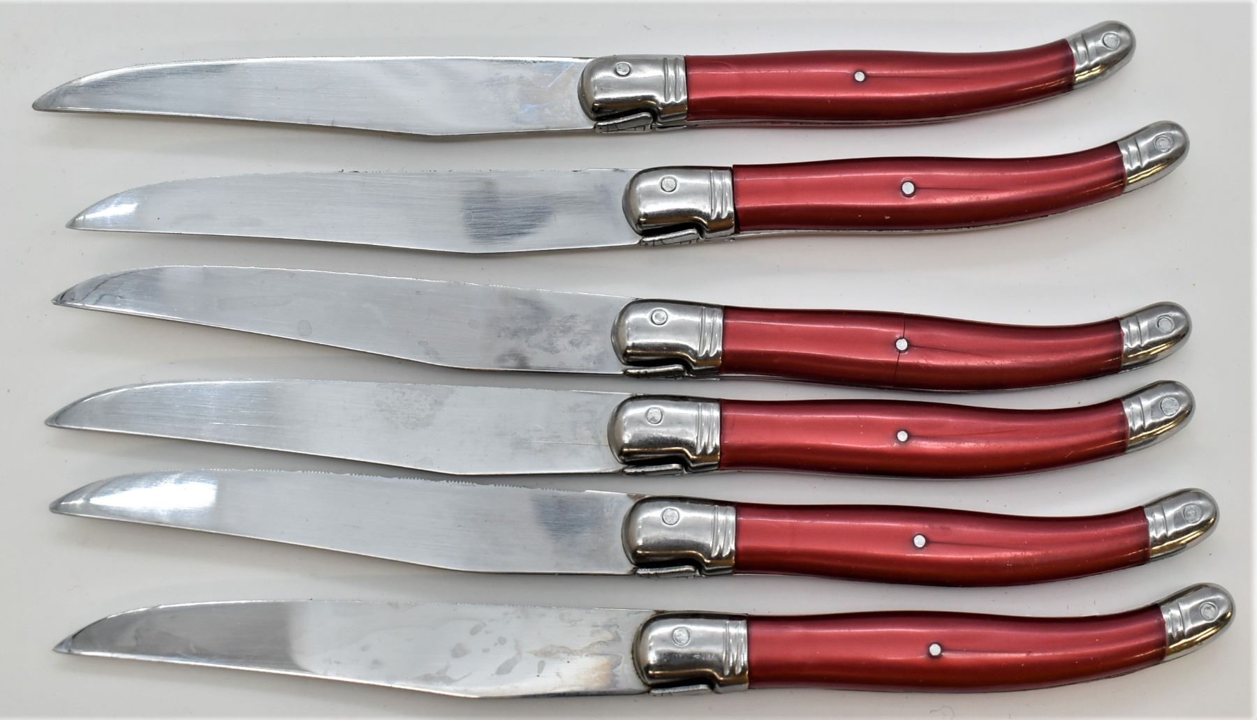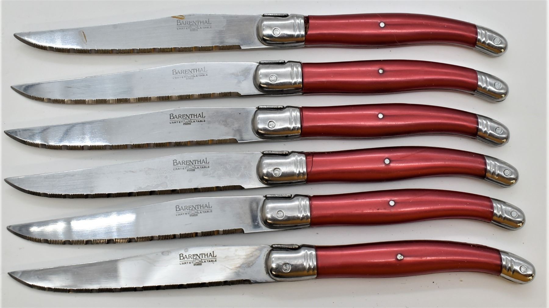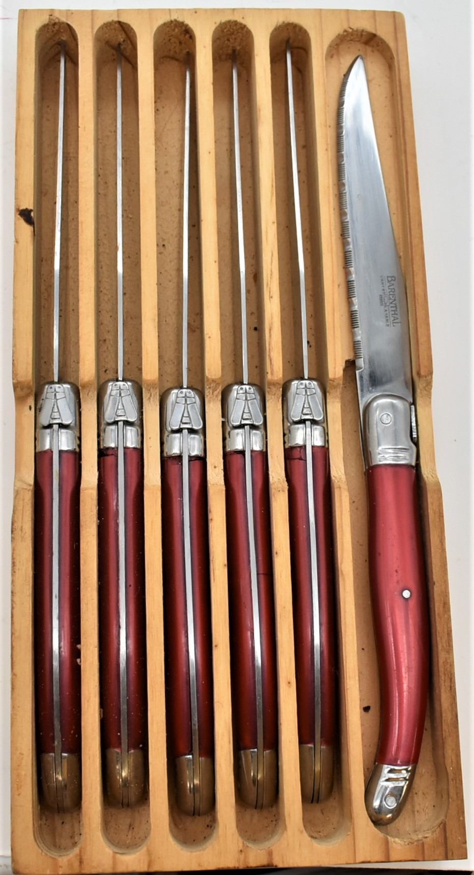 Barenthal Steak Knife Set and Ice Cream Scoop, 6 Red Bee Handles, Stainless Steel Blades, measure 9''L x .75''W, scoop measures 8''L x 1.75''W, knives comes in wood box