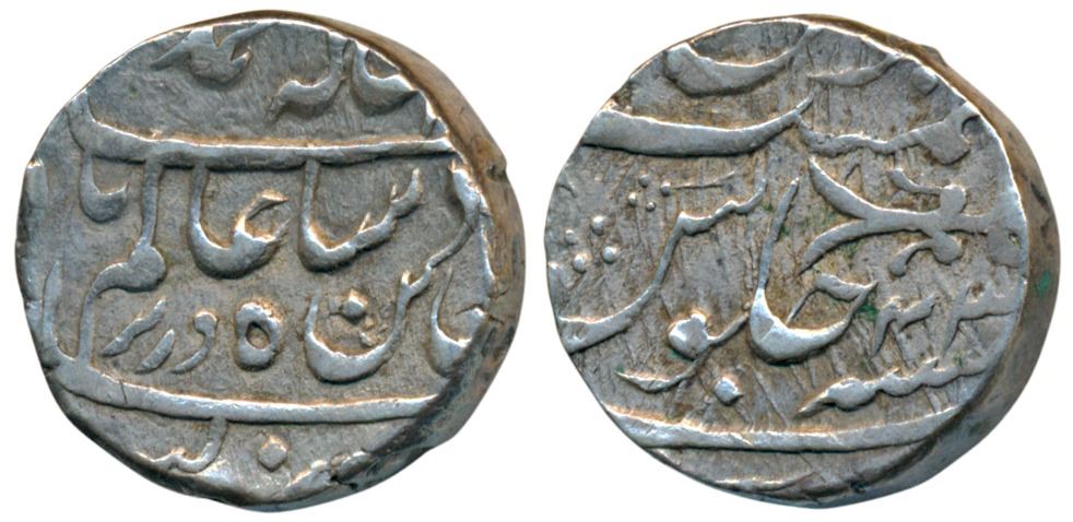Bari Mint, Silver Rupee, 11.03g, the word ‘Wazir’ in the obverse field just below Shah Alam, as a citation for Nawab Wazir Muhammad Khan the existing Prime minister of the State, RY 43, horizontal trident on rev. (KM A19, see Barry Tabore on new Bhopal mints, ONS Newsletter 195; also see P. P. Kulkarni, ND vol 31, p.176). Very Fine+, Rare. Ex. Ken Wiggins Collection.