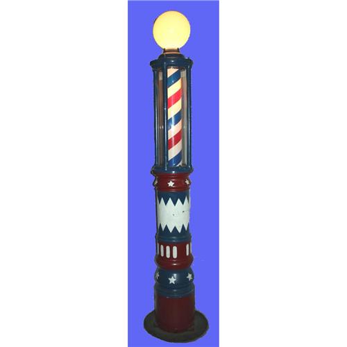 Floor Model Barker Barber Pole - Cast iron. Stands 87" H to top of globe. Painted red, white, and blue.