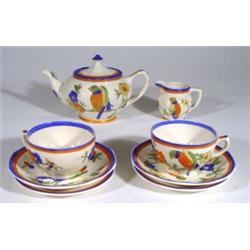 Barker Brothers Art Deco teaset, hand coloured and transfer printed with parrots amongst flowers, comprising teapot, cream jug, two cups, saucers and side plates