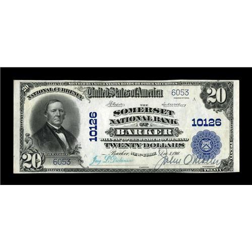 <B>Barker, NY</B></I> - $20 1902 Plain Back Fr. 654 <B>The Somerset NB</B></I> Ch. # 10126<BR>Only two large notes are known from this excessively rare Niagara County community, one of which grades a low end Very Good. This is the other, which has been off the market for thirty years, and, fortuitously for collectors, is at the other end of the grade scale. It is a truly lovely note, with bold colors, bright white paper, and vivid two color signatures, a true miracle of survival from a bank which had only $840 outstanding in large notes in its 1935 accounting. <B>About Uncirculated,</B></I> a true New York trophy item.<BR><BR><b>Shipping:</b> Coin/Currency (<a target="_blank" href="http://www.heritageauctions.com/common/shipping.php">view shipping information</a>)