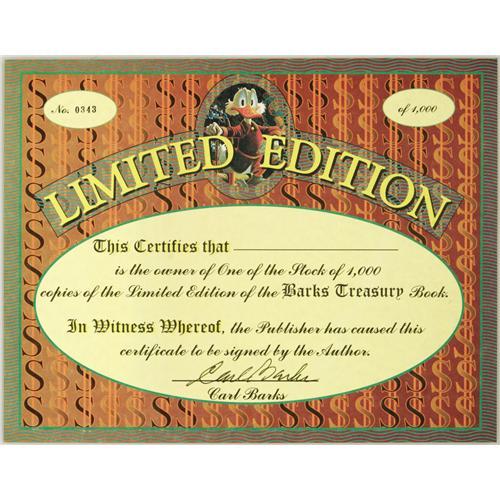 <B>Barks Treasury Special Edition with Signed Certificate (Applewood Books/Walt Disney, 1997).</B></I> A limited edition (#343 of 1,000) super-deluxe bound gallery showcasing tipped-in reproductions of forty color pencil sketches done by Barks in his 96th year, housed in green velvet-lined clamshell case padded with three crumpled and numerous shredded sheets of City of Duckburg currency. The book has a gold-embossed dust jacket, and includes a certificate of authenticity signed by Barks. In great condition, a portion of the case has separated due to dried-out glue but can be easily repaired. <BR><BR><B>Important notice:</B> Heritage usually auctions material at the rate of 200-250 lots per hour. On some occasions eBay Live bid software or the Internet may not be able to keep up with the pace of the auction. We recommend placing a realistic absentee bid now as insurance to avoid disappointment. Occasionally the auctioneer may eliminate or reject an eBay Live bid, and the auctioneer may also reopen a lot after the close of the eBay live bidding (usually because we missed an audience bid), and may reject your bid even if it shows you as the winning bidder. By bidding via eBay Live, you agree that Heritage may award the lot to another bidder at its sole discretion under the circumstances described above or any other reasonable circumstances. Since eBay bids are not shown to us until we open the lot on the floor, we treat those bids just like floor bids. In most cases the floor responds before the eBay bid is presented to us, due to Internet lag time, so for consistency we have made it a policy that floor bids are always considered first over tie eBay live bids. Also please note that all Heritage lots purchased through eBay Live carry a 22.5% Buyer's Premium. Please make sure you read the Terms and Conditions before you bid. This lot is being auctioned in conjunction with a live floor auction by Heritage Auction Galleries. All final auction and invoice information will be supplied by Heritage Auction Galleries, and all other information should be considered preliminary. Lot:41001 <BR><BR><B>Winning Notification and Billing:</B> After the FINAL session in this auction is complete, Heritage will send e-mail and snail mail invoices. This process normally takes several days. All final auction and invoice information will be supplied by Heritage Auction Galleries, and all other information should be considered preliminary. <BR><BR>This auction will be conducted on a live auction floor and over the Internet through eBay Live. If you choose to place an absentee bid, please take a moment to <font color='#0000ff'><u><a href='http://pages.ebay.com/liveauctions/help/before/laabsentee.html'>learn how eBay Live absentee bidding works</a></u></font><font color='#000000'>