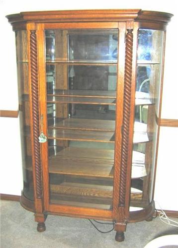 Impressive bow side oak China cabinet w/ barley twist accents on the sides of the single door. Lock, key avail. 3 oak, 1 glass shelf, mirror back. 65"tx14"dx48"w. (5-196)