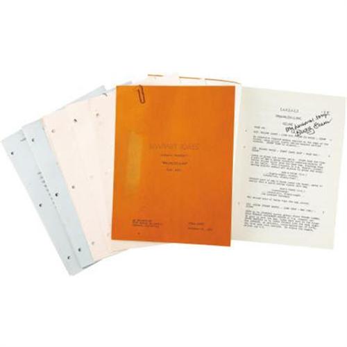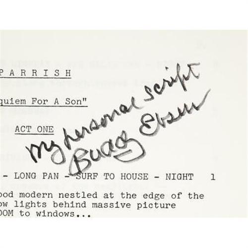 <B><I>Barnaby Jones</B></I></B></I> <B>Premiere Show Signed Script.</B></I> Here's the very first script for Buddy Ebsen's fondly remembered hit series <I>Barnaby Jones,</B></I> titled "Requiem for a Son," signed in black ink, "My personal script Buddy Ebsen." It's all here -- the killing of Barnaby's son Hal, the mourning of Barnaby's daughter-in-law Betty (played by Lee Meriwether), and Barnaby's mission to find his son's killer. We even become acquainted with Barnaby's milk habit. The script is marked "Final Draft," dated November 15, 1972 and contains many pages of revisions; there's also a second copy of the script, paper-clipped together. Interestingly, the show was originally titled <I>Parrish</B></I> and the second page of the script notes, "Please change John Parrish to Barnaby Jones wherever it appears." In Excellent condition. <I>From the Buddy Ebsen Estate.</B></I><BR><BR><b>Shipping:</b> Flat Material, Small (<a target="_blank" href="http://www.heritageauctions.com/common/shipping.php">view shipping information</a>)