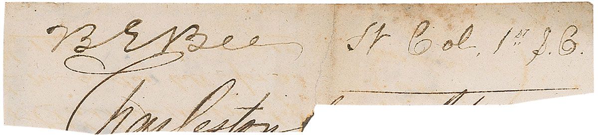 Confederate general (1824–1861) mortally wounded at the First Battle of Bull Run, but best known for inspiring Thomas J. ‘Stonewall’ Jackson’s nickname. Exceedingly rare Civil War–era ink signature, “B. E. Bee, Lt. Col. 1st S. C.,” on an off-white 5.5 x 1.25 clipped slip. Central vertical tape-repaired tear and foxing to upper right, otherwise fine condition. An especially desirable example, as Bee adds the initial rank he was given upon joining the 1st South Carolina Regulars.