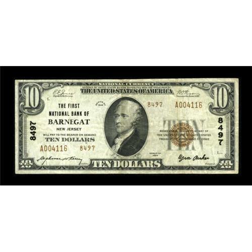 <B>Barnegat, NJ</B></I> - $10 1929 Ty. 2 <B>The First NB</B></I> Ch. # 8497<BR> As nice a small note as we've seen from this sought after Ocean County bank in several years. Sharp <B>Very Fine, </B></I>considerably higher grade than the example that realized $1069.50 at auction two years ago. <BR><BR><b>Shipping:</b> Coins & Currency (<a target="_blank" href="http://www.heritageauctions.com/common/shipping.php">view shipping information</a>)