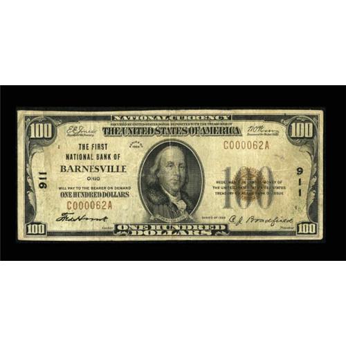 <B>Barnesville, OH</B></I> - $100 1929 Ty. 1 <B>The First NB</B></I> Ch. # 911<BR> A neat charter number is noticed on this well circulated example. A miniscule 80 sheets total of this particular number were printed. A few pinholes are visible. <B>Very Good</B></I>.<BR><BR><b>Shipping:</b> Coins & Currency (<a target="_blank" href="http://www.heritageauctions.com/common/shipping.php">view shipping information</a>)