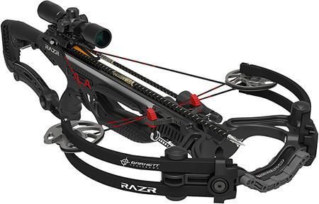 Barnett Crossbows Razr Crossbow Illuminated 4x32 Scope Black w/Arrows and Quiver The Barnett Razr features a CNC machined 7/8" picatinny rail, custom composite laminated limbs, retractable underarm support, integrated skinning knife, adjustable butt pad, string suppressors, finger reminders and pass-through foregrip, and a 43% lighter riser. It comes with a Premium Illuminated 3x32 scope, rope cocking device, three (3) arrow quiver, and three (3) 22" Headhunter arrows. It measurers 20" from axle to axle.