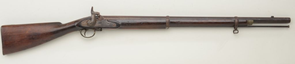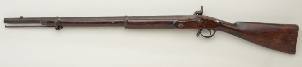 Barnett percussion single shot rifle marked “London”, .75 cal., 30” heavy barrel, wood stock with cartouche on right side of butt stock “Barnett Gunmakers London”, sling swivels, iron ramrod, brass butt plate. Thisgun is in overall good condition showing a brown patina on metal surfaces with good action, dark bore, good markings and overall good wood stock with scattered old mars and scratches from carry and storage. Est.:$350-$700.