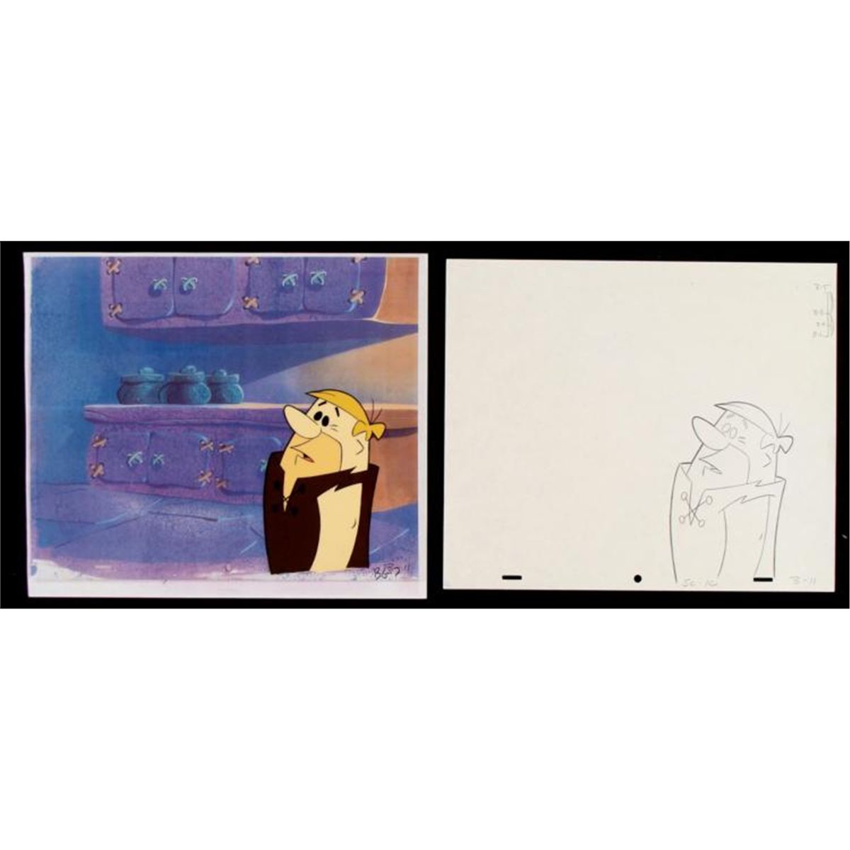 So what did Betty ask of me again? Shoot, I knew I should have written it down; she is not going to be happy... The cel comes with a matching drawing overlay. * * Original Production Art Cel, Drawing, and Reproduction Background Original "rough" animation drawing, with notations in black. Barney has been outlined in blackOverall Size of the Cel: 10 1/2" x 12 1/2" Overall Size of Reproduction Background: 11" x 13 1/4" * Excellent condition This is an original hand-painted cel set-up used in the production of an episode of "The Flintstones." Each one-of-a-kind set-up represents a slight change in position of the characters. When individually photographed and projected in rapid succession, the images appear to move. * To create production cels, the original animator's drawing is transferred onto an acetate cel (by hand-inking and/or photo copying). The cel is then hand-painted on the reverse side. The background accompanying this set-up is a reproduction background. * * The cel, drawing, and background are ready to be matted and framed. The animator's notations are shown at the bottom of the cel and drawing. *