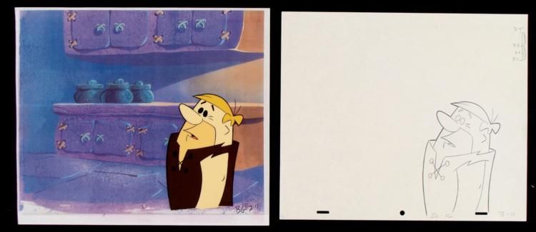 So what did Betty ask of me again? Shoot, I knew I should have written it down; she is not going to be happy... The cel comes with a matching drawing overlay. * * Original Production Art Cel, Drawing, and Reproduction Background Original "rough" animation drawing, with notations in black. Barney has been outlined in blackOverall Size of the Cel: 10 1/2" x 12 1/2" Overall Size of Reproduction Background: 11" x 13 1/4" * Excellent condition This is an original hand-painted cel set-up used in the production of an episode of "The Flintstones." Each one-of-a-kind set-up represents a slight change in position of the characters. When individually photographed and projected in rapid succession, the images appear to move. * To create production cels, the original animator's drawing is transferred onto an acetate cel (by hand-inking and/or photo copying). The cel is then hand-painted on the reverse side. The background accompanying this set-up is a reproduction background. * * The cel, drawing, and background are ready to be matted and framed. The animator's notations are shown at the bottom of the cel and drawing. *
