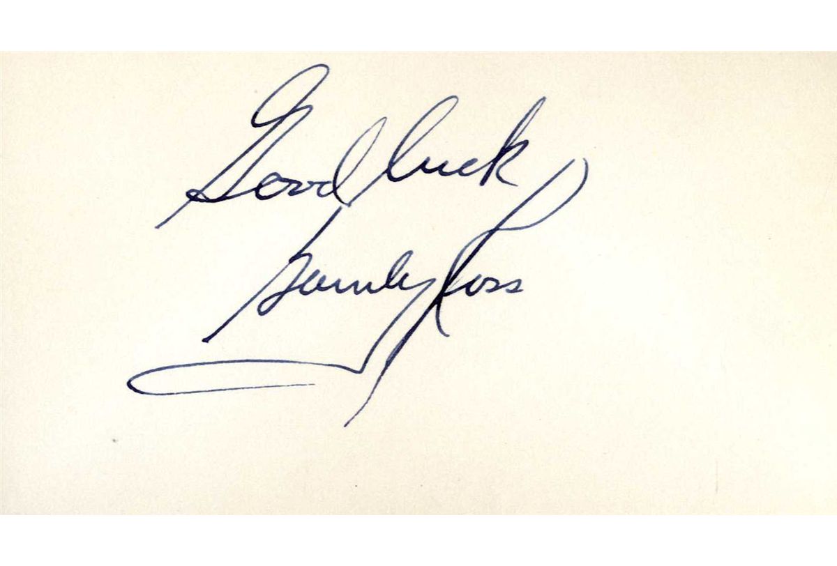Barney Ross autograph on a 5'' x 3'' card. The world champion boxer in three weight divisions signs: ''Good luck / Barney Ross''. Inducted into both the International Boxing Hall of Fame and the World Boxing Hall of Fame, Ross was known for never being knocked out during his career. His signature is accompanied by a 5.5'' x 3'' envelope addressed to a Mildred Davis and postmarked from Chicago on 16 March 1941. Envelope is very good. Autograph is near fine.