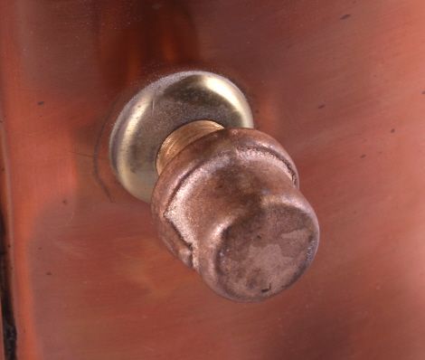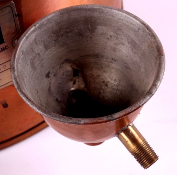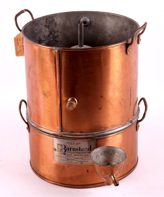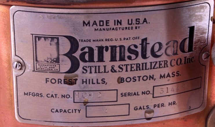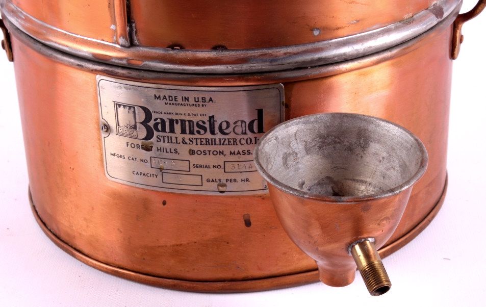 This is a copper still made by Barnstead Still and Sterilizer Co. Inc. It still has the original inspection tag from the factory. It has a capacity of .5 gallons per hour. The still is in very good condition. It measures 9.5" in diameter and is 12" tall.