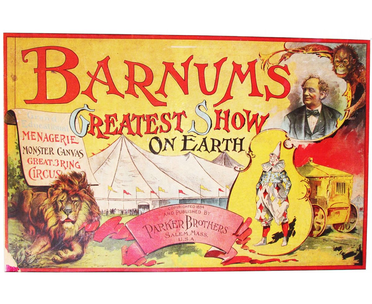 Barnum's Greatest Show on Earth Board Game Box Cover. Copyrighted 1894 and published by Parker Brothers, Salem, Mass. Excellent color and graphics. Framed under glass to display both front and back with rules of play. Some age discoloration otherwise very good condition. 26 1/2 X 19 1/2 inches overall.