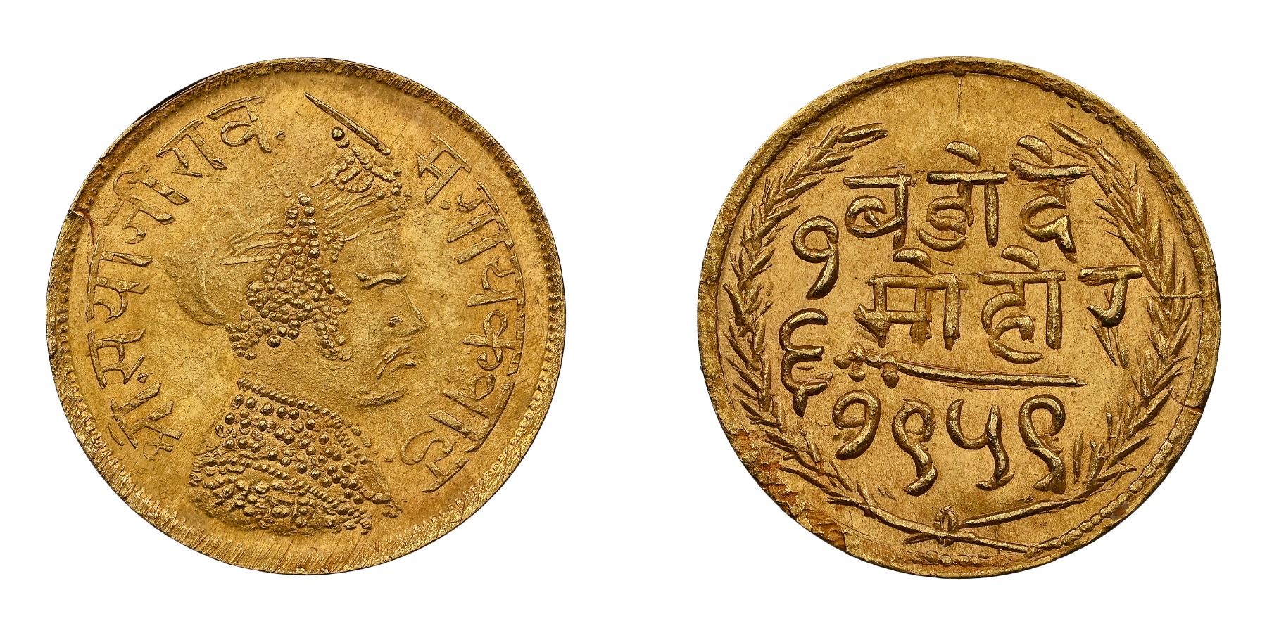 Baroda, Sayaji Rao III (AH 1292-1357 / VS 1932-1995 / AD 1875-1938), Gold 1/6 Mohur, VS 1959 (1902), 1.04g, KM#Y-37 Obv: Bust of King, with turban, facing left, Rev: Denomination and Date in wreath. Graded & amp; Slabbed by NGC MS 64 [6765084-022]. Pop 3/1.Notes: Small in stature but striking in appearance, this handsome specimen displays aged, golden surfaces that are clear of any discernible imperfections. The devices are fully rendered and the intricate detail upon the bust is sharp, despite being struck with rusty dies. Currently only topped by 1 other certified example of this date, scare as such.