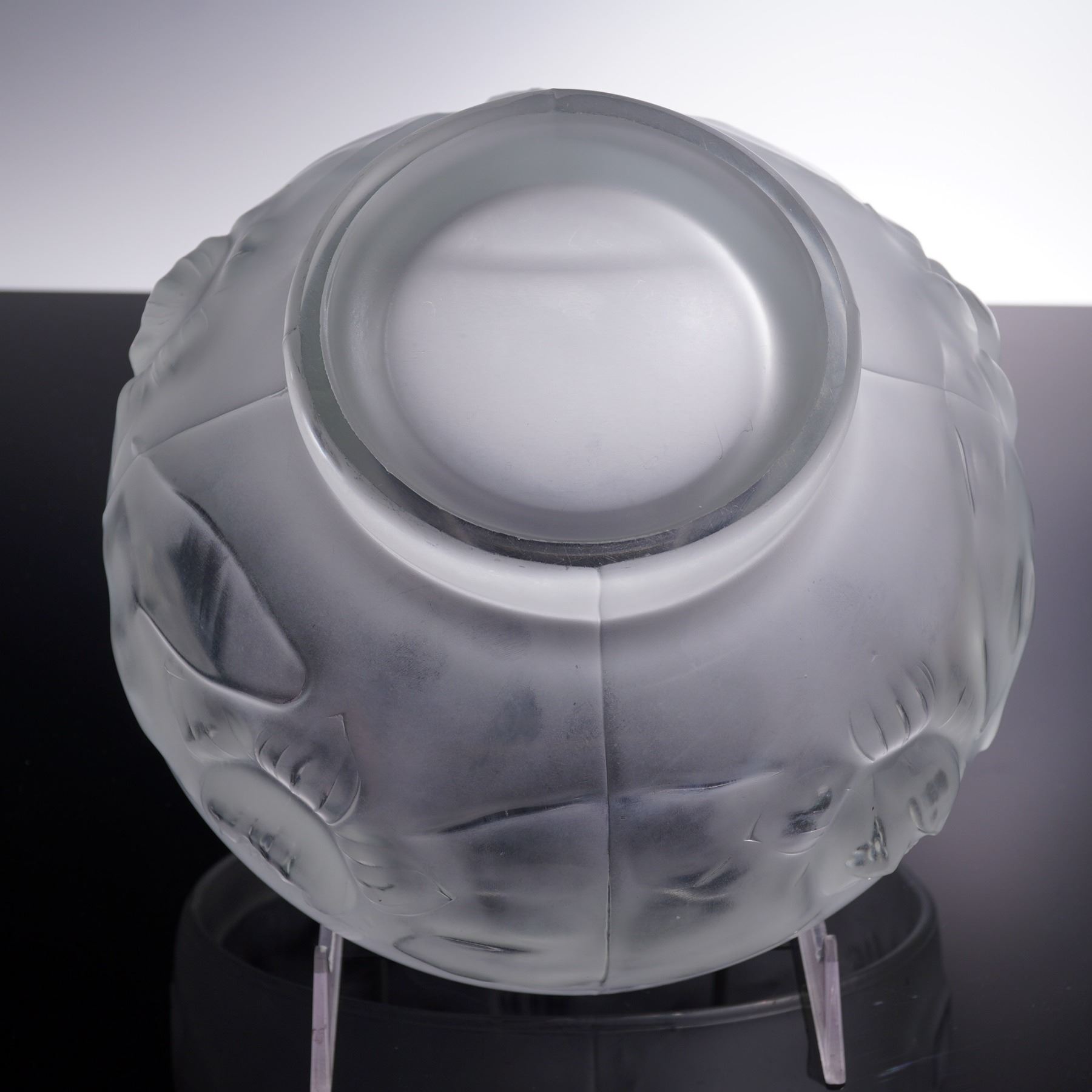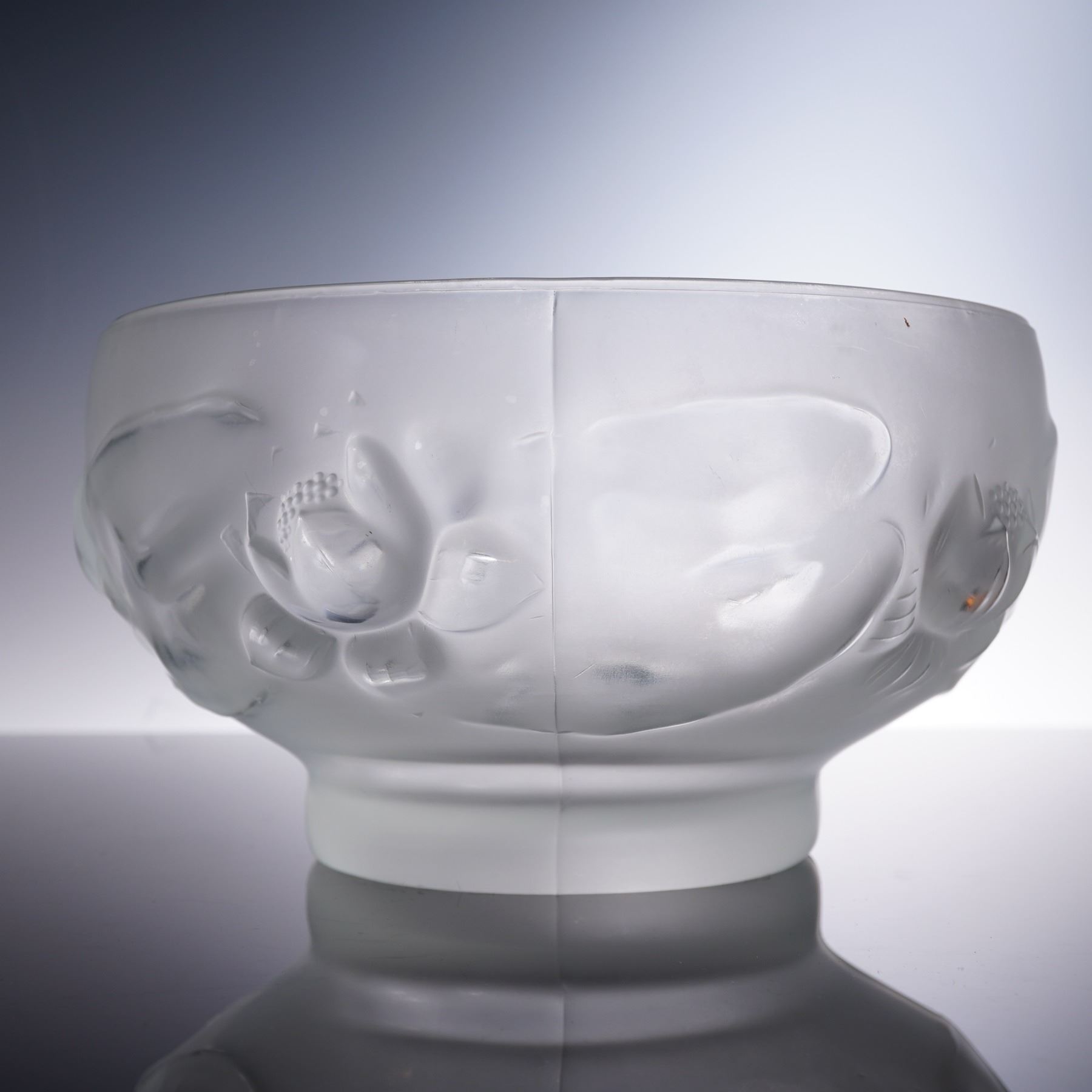 An elegant frosted satin glass bowl with molded relief lotus blossoms encircling the exterior. The design and execution are consistent with the Barolac line produced by Josef Inwald in Czechoslovakia during the 1930s. Though unmarked, the floral motif, satin finish, and press-molded form closely resemble known Barolac models such as the "Lotus" or "Water Lily" bowl. A classic example of Art Deco era Czech glasswork, prized for its soft translucence and sculptural quality.