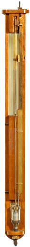 Barometer, um 1900 Unbezeichnet, zaponierte Messing-Skala, großer Quecksilberbehälter mit Einstellschraube, mit Pendel zur Justierung, Länge 105 cm.