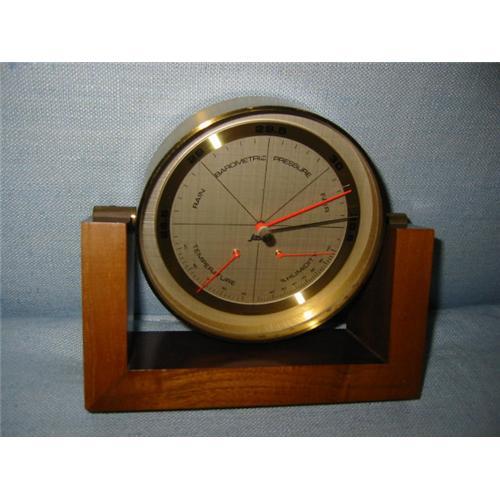 contemporary barometer alumin. on wood stand and is attractive. measures about 6 inch tall and 6.5 wide with 4 inches deep (on wood). is in good condition tarnished in places. normal wear and tear. made in Germany base is wood. shape and pattern art deco. made by Jason. cover is made of plastic not glass. 4.5 in diameter. good looking shelf or mantle barometer and something to think about!!!