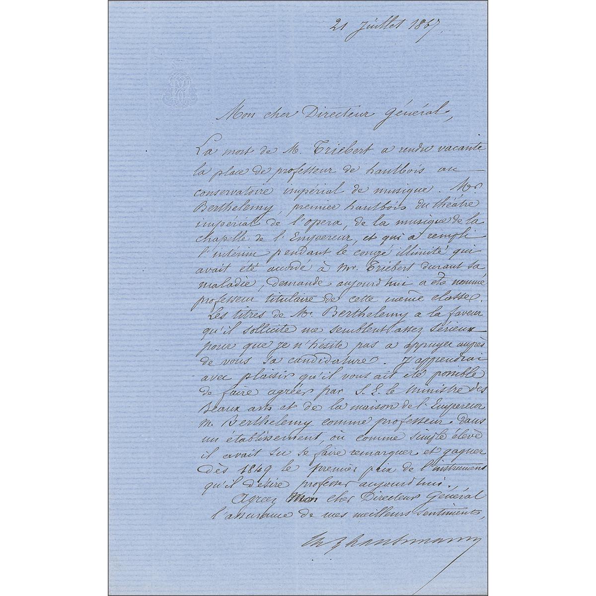 French civil planner (1809–1891) whose name is associated with the rebuilding of Paris. LS in French, signed “G. E. Haussmann,” one page, 5.5 x 8, July 21, 1867. Untranslated letter to the “director general.” In fine condition, with light lines of toning from prior storage in a magnetic photo album.