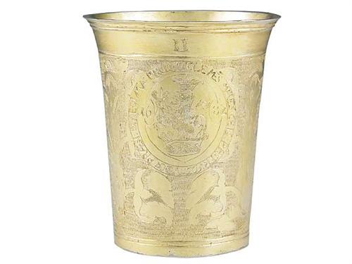 Silver, 171 g, with vermeil inside and outside. Plain tapering form, finely shaped rim. Engraved zigzag and foliate motifs; oval medallion with coat of arms. Inscription: CLEMES MIKES CELS: PR: TR: COS: IVDiCY PRAESI: & REGNIMA: PROTONO: 1682. In the