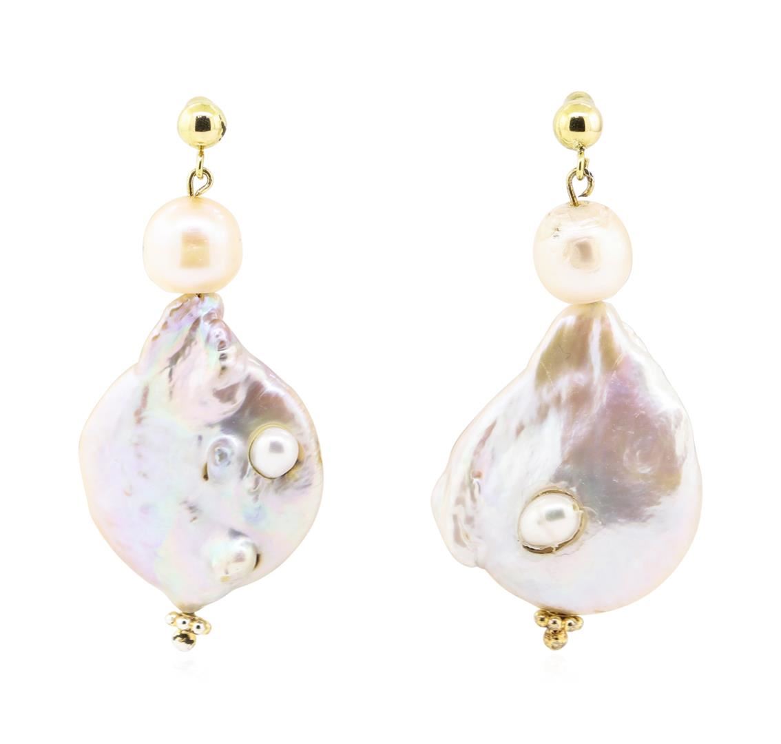One pair of baroque coin pearl earrings with a dangle of 45 millimeters with 14KT yellow gold plating and a total weight of 12.5 grams.