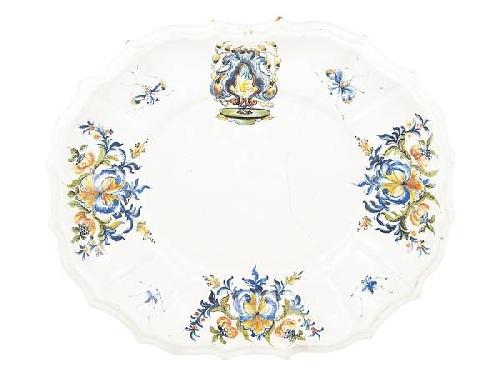 Faience with tin glaze. Oval bowl with colour painting, lobed and fluted rim. On the border there are alternating stylised foliate motifs and insects. At the lower part in the middle there is a clerical coat of arms with an archbishop’s headwear and ten tassels (in a shield there is a lion holding a sword). Hair cracked. North-Italian (?), circa 1740 Size: 32 x 27 cm