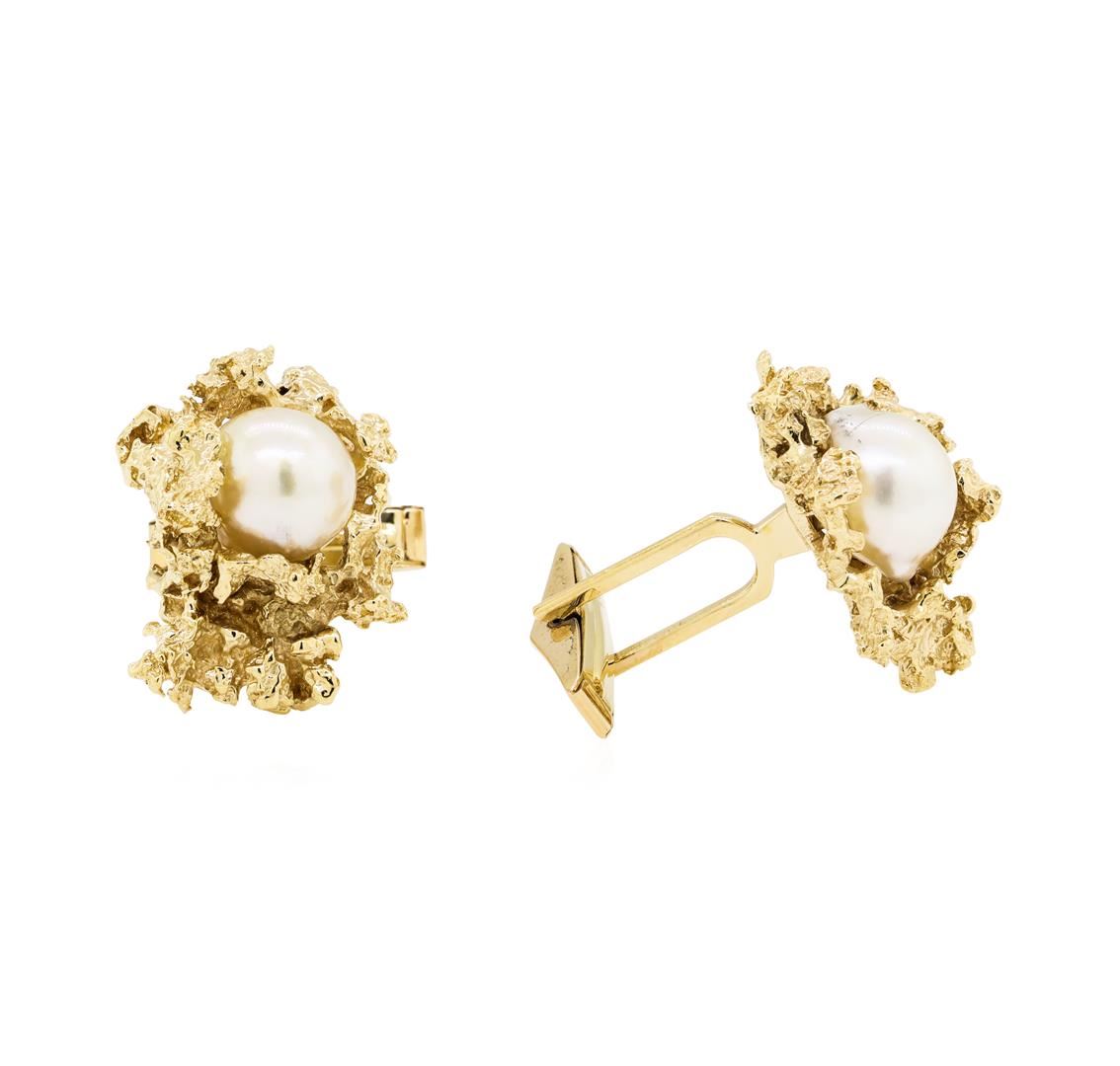 One pair of baroque pearl cufflinks featuring: 14KT yellow gold weighing 17.6 grams.