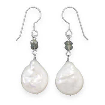 Sterling silver french wire earrings with cultured freshwater baroque pearl and labradorite drops. The pearls are approximately 12.5mm x 16mm and the labradorite beads are 3mm - 3.5mm. The earrings hang approximately 37mm. .925 Sterling Silver