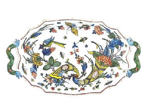 Faience with tin glaze and colour painting. Oval form with lobed border and snake handles. Double horn of plenty decoration with coloured flowers, butterflies and exotic bird. The handles are restored. Marked: with green on the reverse, the painter’s initials: P A . Rouen, circa 1760 Literature: Curtil: Marques et Signatures de la Fayence Francaise, page 116 Size: 41 x 25.5 cm