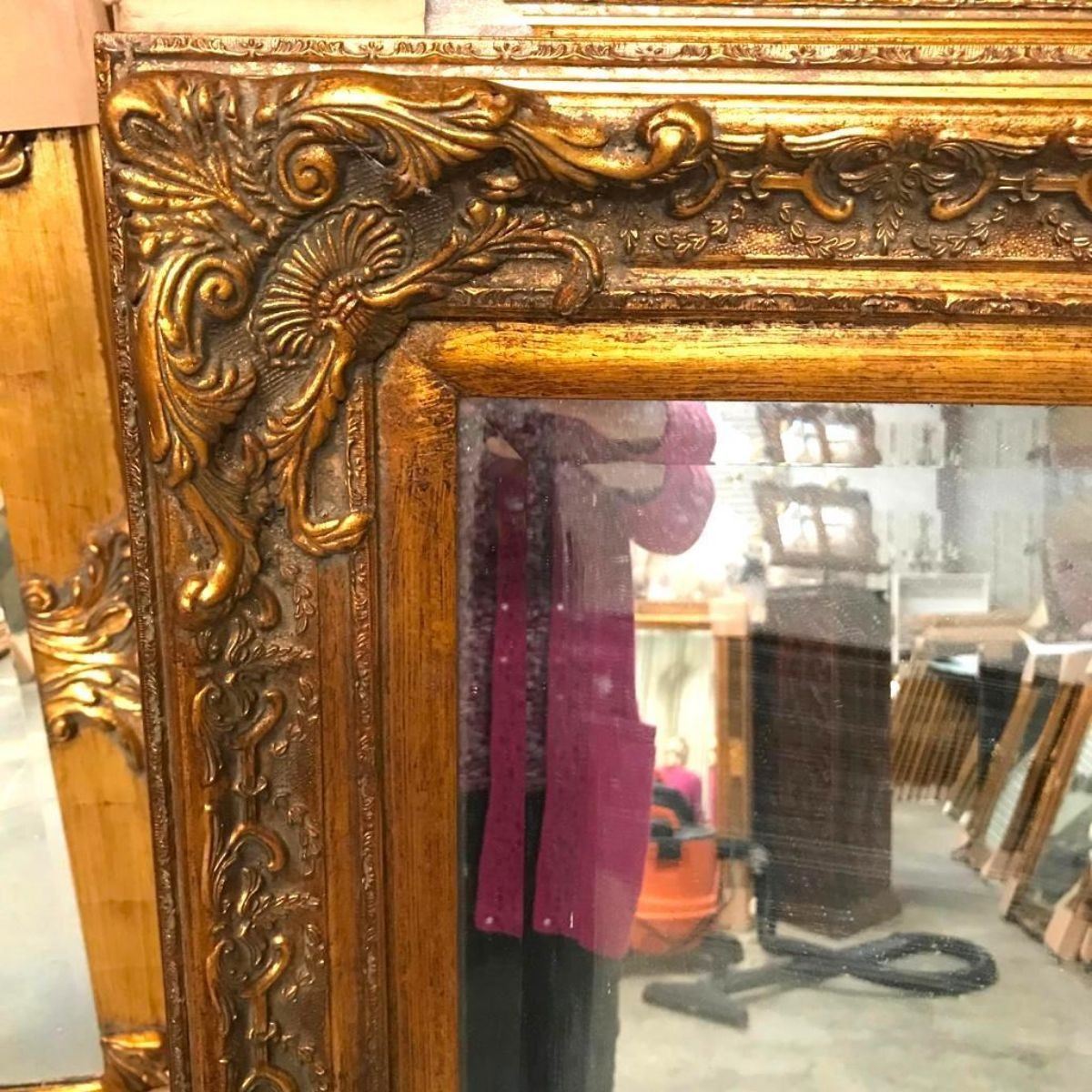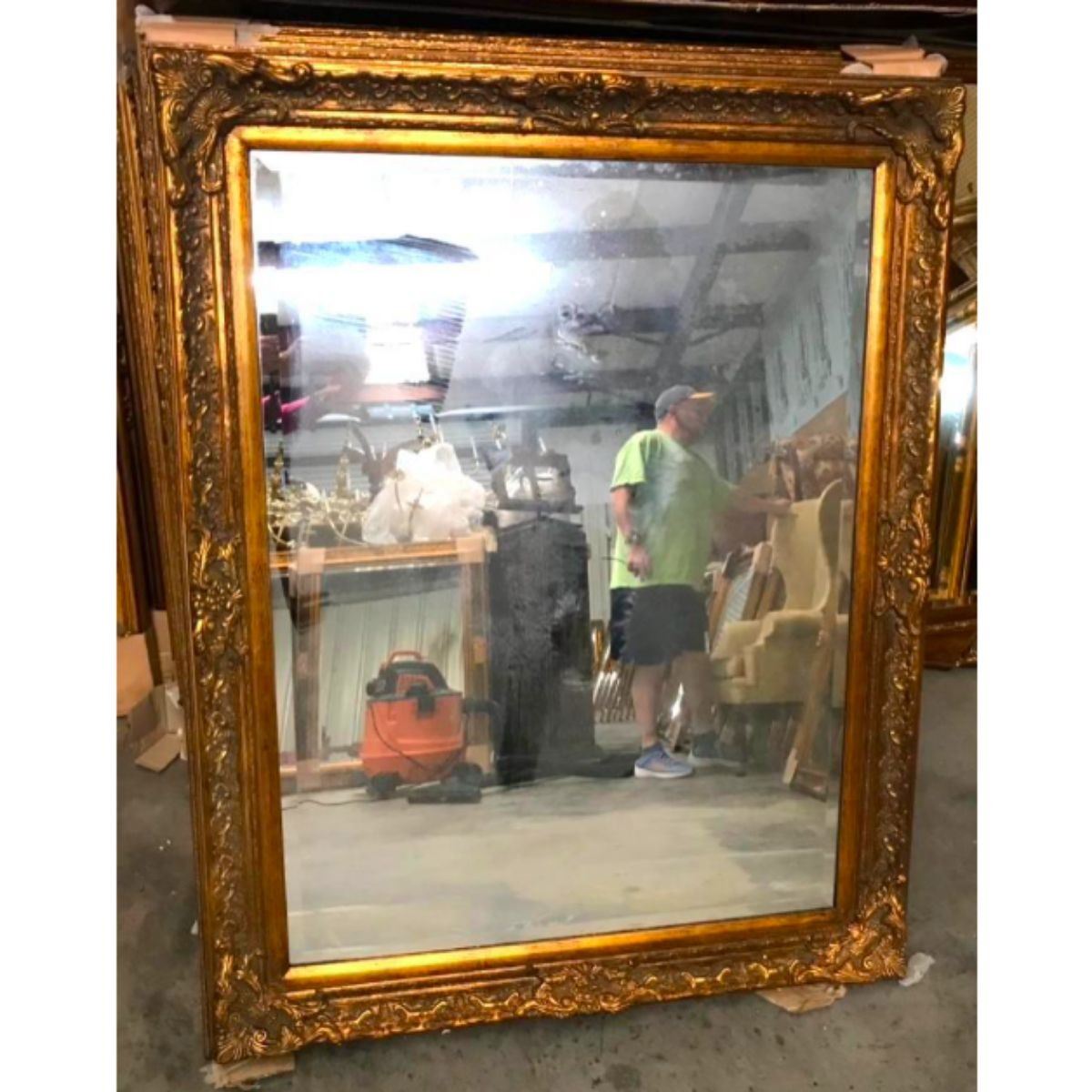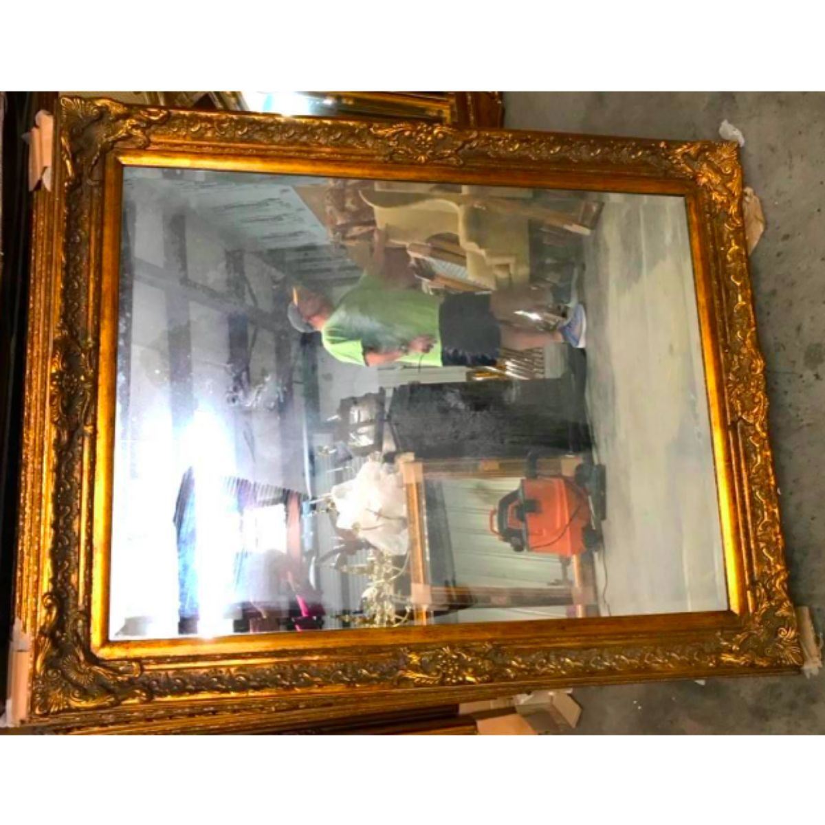 Baroque-style, gilt over solid wood carved frame ( 38" X 48" ) inset with beveled mirror glass ( 30" X 40" ). Can be hung both vertically & horizontally. **** this is a solid wood carved frame - a heavyweight piece requiring special shipping, delivery.