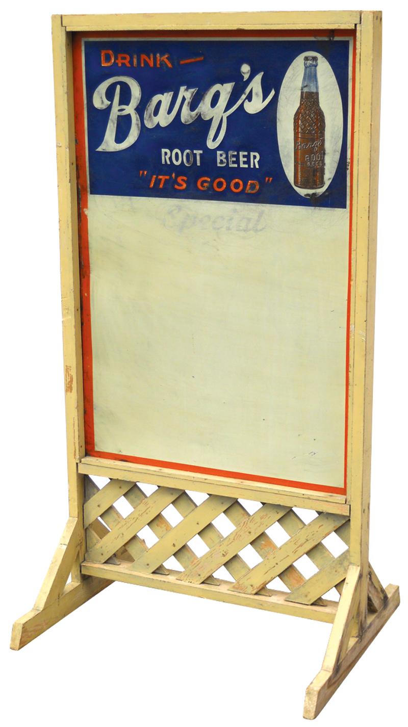 Barq's Root Beer curb sign, double-sided litho on metal, Good weathered cond, 43"H x 22"W.