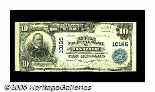 <B>Barre, MA</B></I> - $10 1902 Plain Back Fr. 628 <B>The Second NB</B></I> Ch. # 10165<BR>When this bank closed in 1929 the community was left without a federally chartered financial institution. The <B>Very Fine</B></I> example we offer tonight is nicely margined and still retains the officers' stamped signatures.