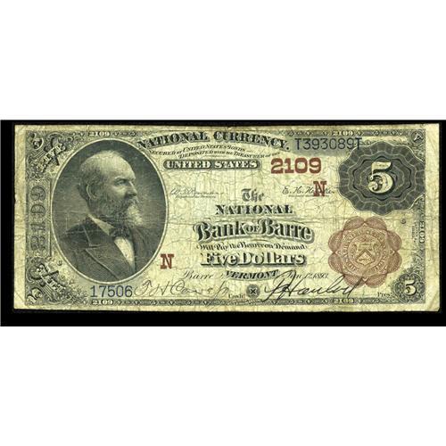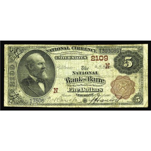 <B>Barre, VT</B></I> - $5 1882 Brown Back Fr. 472 <B>The NB of Barre</B></I> Ch. # (N)2109<BR>A scarce note from a bank which issued First and Second Charter notes only before liquidating in 1913. This is a handsome and evenly circulated $5 Brown Back with nary a problem of any kind. Pleasing pen signed <B>Fine.</B></I>