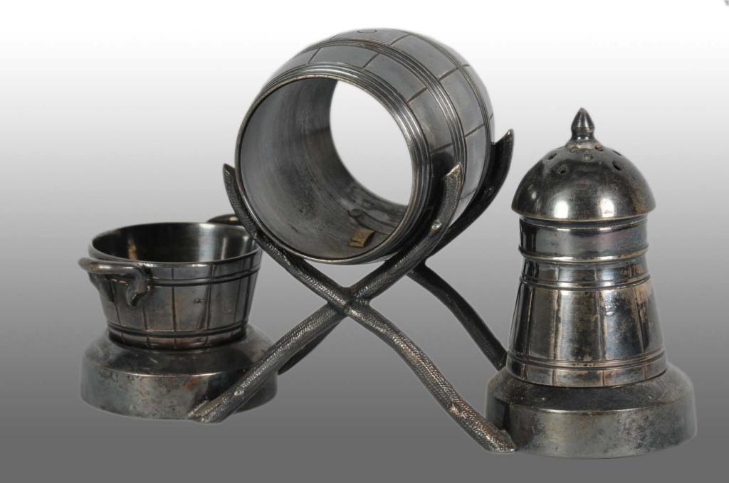 Barrel napkin holder has bucket open salt with pepper shaker supported by branches. No manufacturer's name or number with some silver loss to piece. Condition (Very Good).