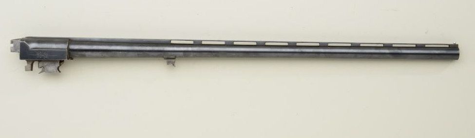 Barrel from Ithaca Single Barrel Trap, 12 gauge Serial #265401. Barrel has been reduced to 27-1/4" shows ventilated rib and a constriction at the end of the muzzle where it has been fitted for choke tubes which arenot included. 80-90% blue, bore good. Est.; $150-$300.