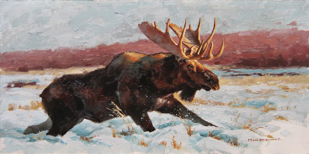 Artist: Mark McKenna. Title: Barreling Through. Size: 10" x 20". Medium: Oil on linen. Description: Capturing the energy and personality of an animal in a painting is a difficult task. Moose, though seemingly awkward and clumsy, are some of the most agile and graceful creatures in the western world. I was thrilled to be able to capture this mature bull in his full stride, barreling through the deep snow as though it wasn't even there. These animals are made to make stuff like this look easy.