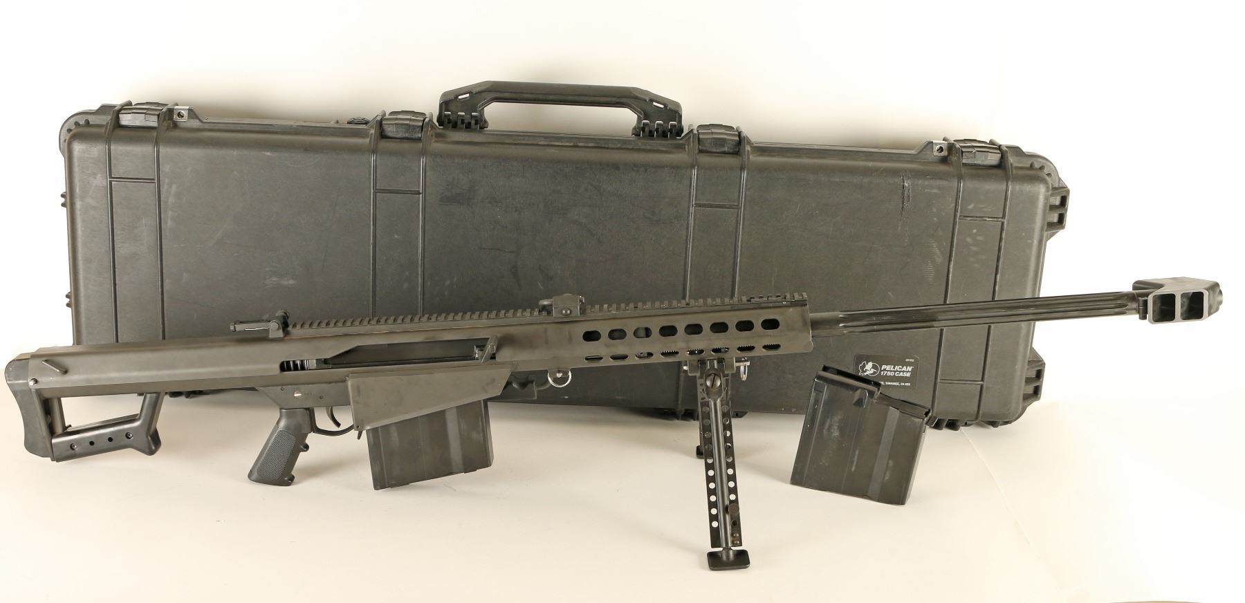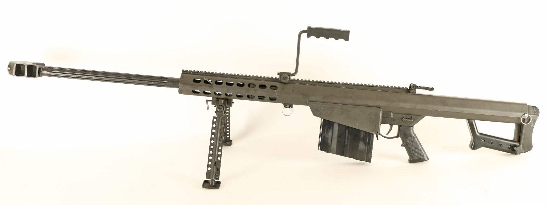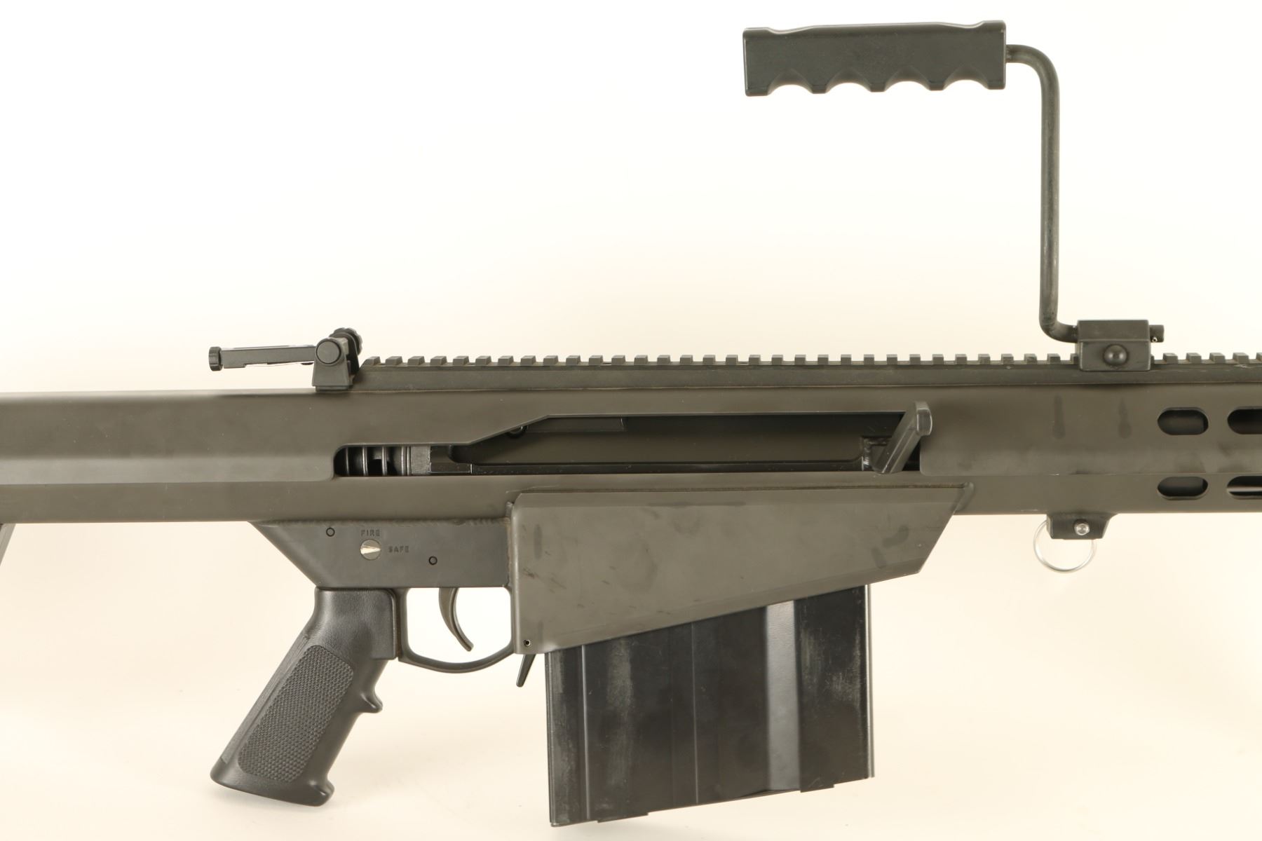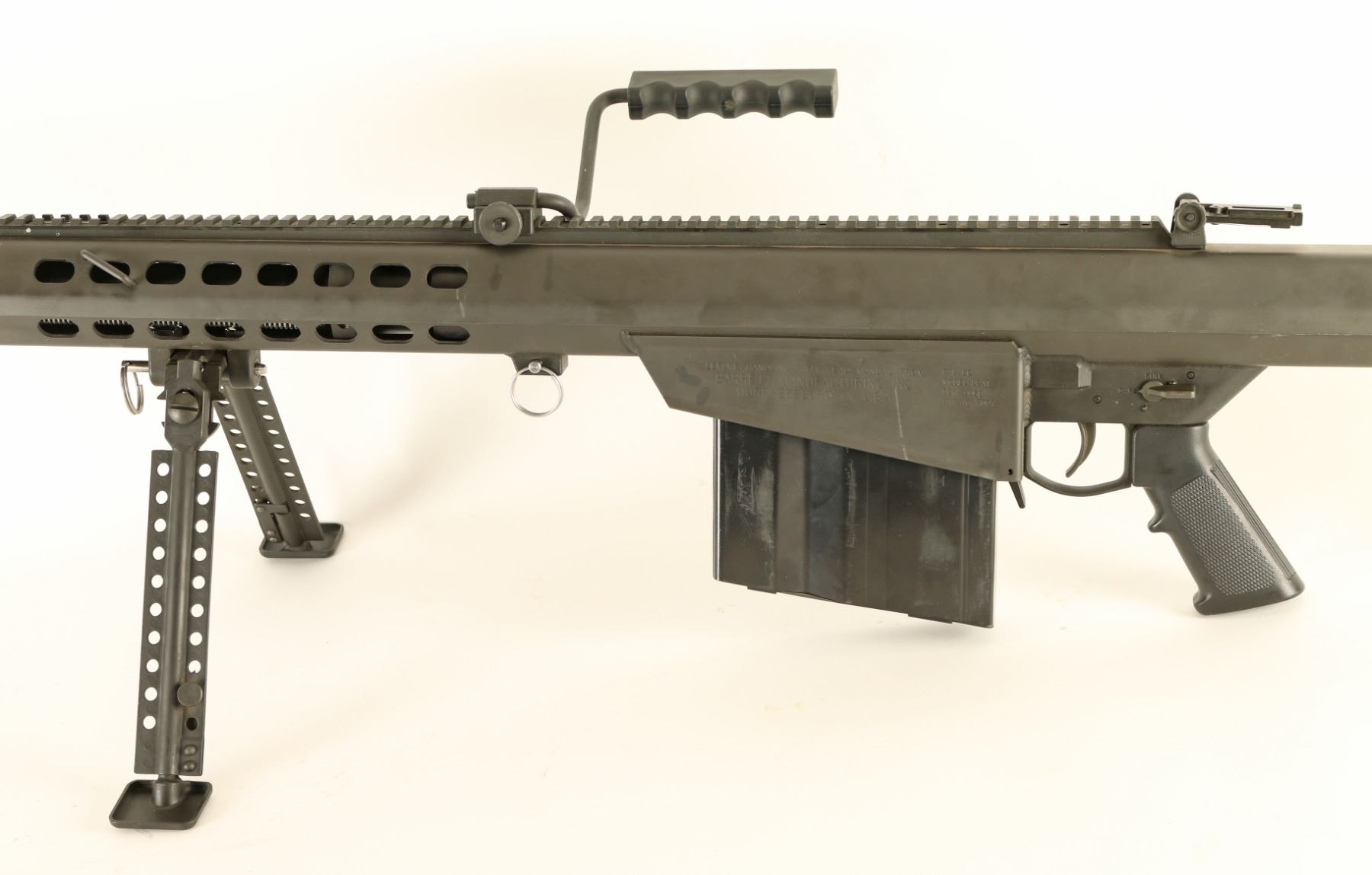 'Light Fifty' Big bore recoil-operated semi-automatic anti-materiel sniper rifle chambered in .50 Browning Machine Gun. Features a matte grey finish, heavy 29" fluted barrel, installed muzzle break, full-length optic rail with integral flip-up post front sight, fully-adjustable folding rear aperture sight, adjustable folding bipod, removable carry handle, detachable 10 round magazine, smooth wide trigger, manual safety, A2 pistol grip & rubber recoil pad. Includes the factory Pelican 1750 hard case with Otis cleaning kit and spare magazine. Rifle exhibits light scattered wear with approximately 95% original finish intact. Action is sound and the bore is pristine.