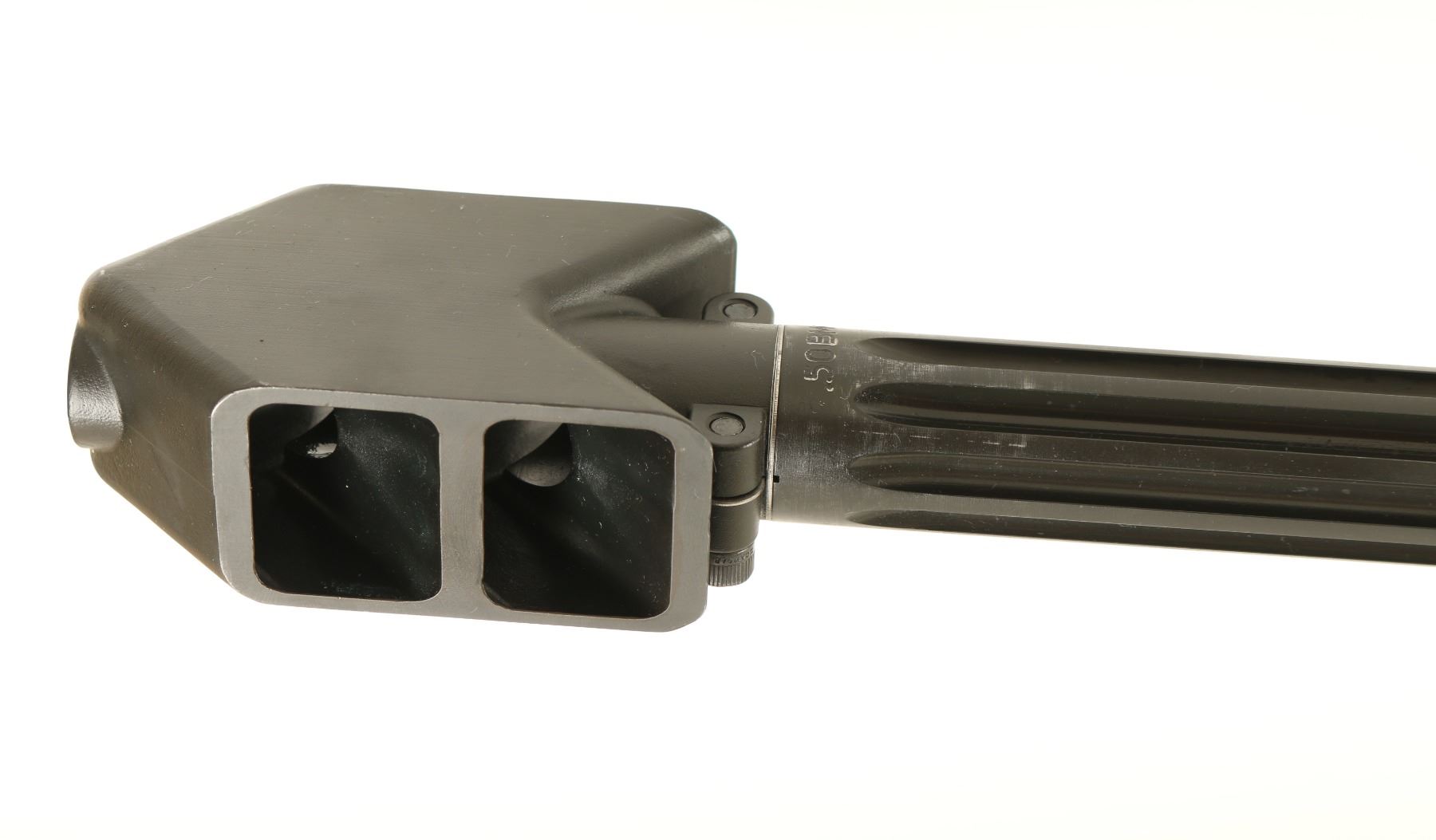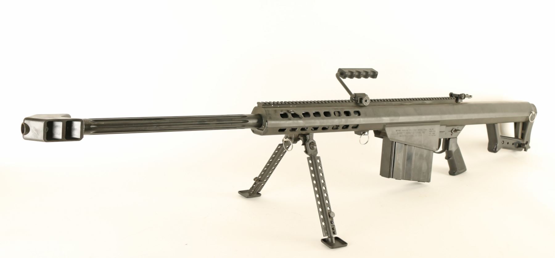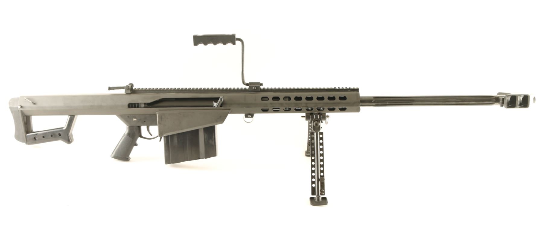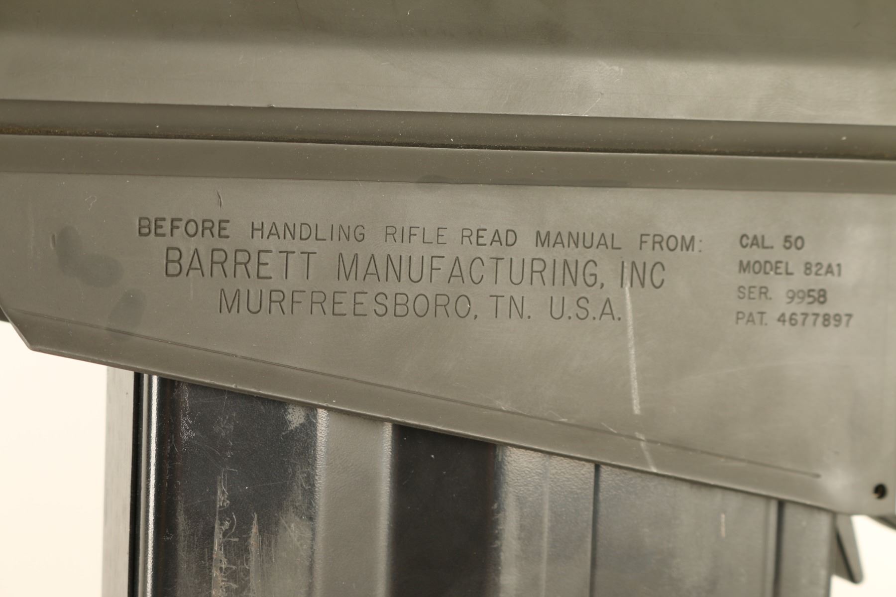 'Light Fifty' Big bore recoil-operated semi-automatic anti-materiel sniper rifle chambered in .50 Browning Machine Gun. Features a matte grey finish, heavy 29" fluted barrel, installed muzzle break, full-length optic rail with integral flip-up post front sight, fully-adjustable folding rear aperture sight, adjustable folding bipod, removable carry handle, detachable 10 round magazine, smooth wide trigger, manual safety, A2 pistol grip & rubber recoil pad. Includes the factory Pelican 1750 hard case with Otis cleaning kit and spare magazine. Rifle exhibits light scattered wear with approximately 95% original finish intact. Action is sound and the bore is pristine.