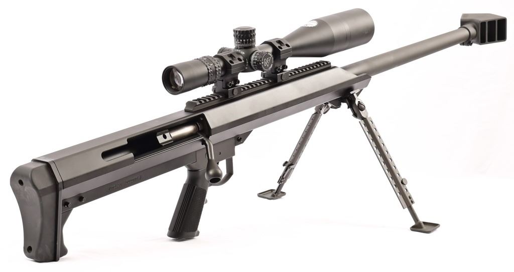 Single shot, 32" heavy barrel, SN AD002777. Night Force 8-32x56 scope w/ original box. Barrett scope mount. Approximately only 10 rounds fired through gun, comes with original Pelican hard case.