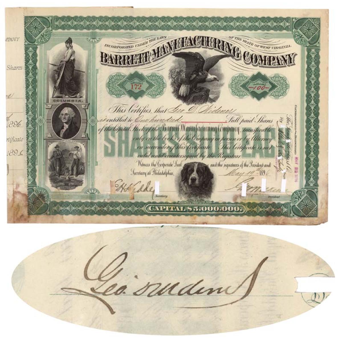 1896, West Virginia. Stock certificate for 100 shares. Green/Black. Multi-vignetted certificate with eagle at top, dog head at bottom, and Standing Lady Liberty, portrait of George Washington and West Virginia state seal shown vertically at left border. Issued to and signed on verso by George D. Widener (1861 - 1912) American businessman who died in the sinking of the RMS Titanic. Heavy damp staining along bottom of certificate. Good. Stamp and punch cancellations not affecting Widener's signature.
