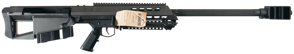 A shortened/improved version of the Model 90, produced without sights, fluted barrel has the Barrett's signature "arrowhead" muzzle brake, frame is equipped with a folding steel bipod, right handed safety, Lone Star Ordnance AR-style pistol grip, standard markings on the magazine well, and a heavy solid rubber recoil pad. Comes with a heavy duty Pelican hard case, manual from Barrett and Otis cleaning set.