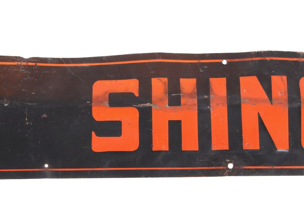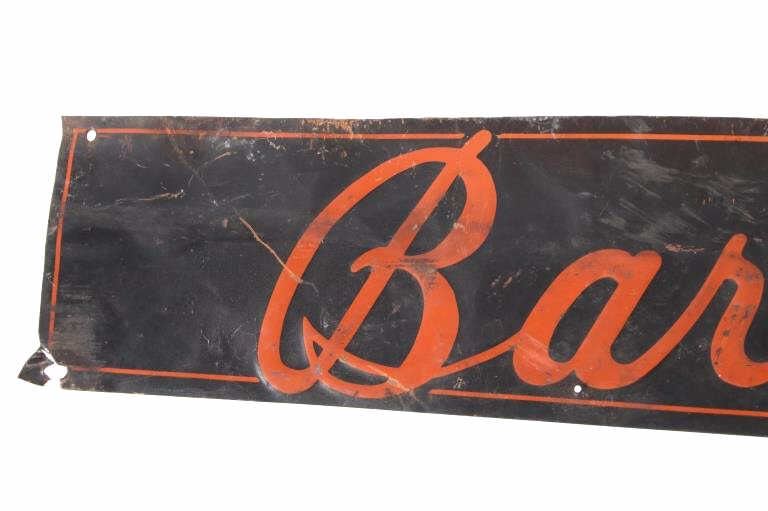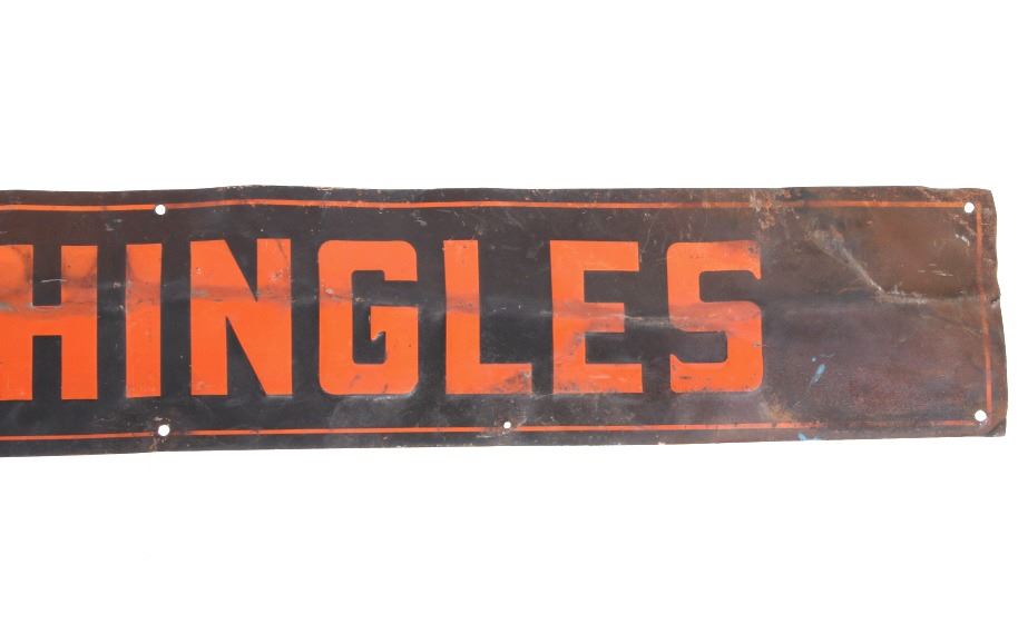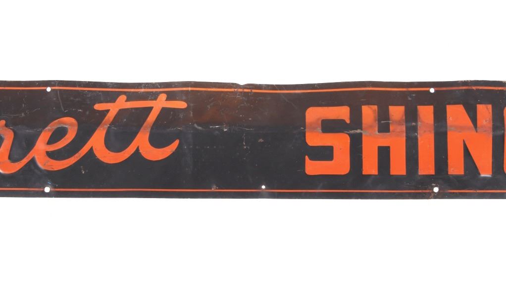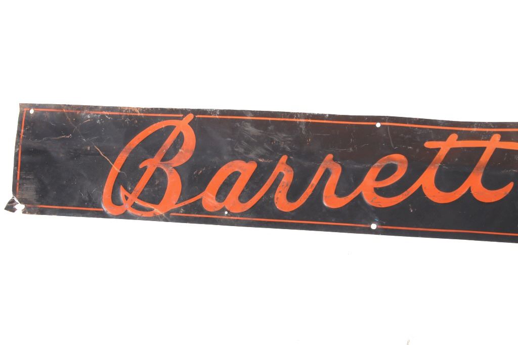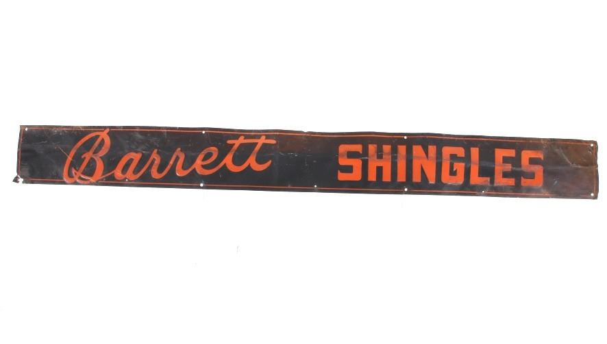 Featured in this lot is this original Barrett Shingles tin advertisement sign circa 1950's. The tin sign shows a professionally crafted tin construction that features a black and red border with red lettering with 'Barrett' in cursive and 'Shingles' in block letter all set to a black field. The condition of this tin sign is fair with a tear in the bottom left hand corner and some oxidation and patina adorning the face of the sign with a crease shown horizontally but otherwise shows fair overall condition. The measurements of this sign is 3 3/4" x 3 3/4".