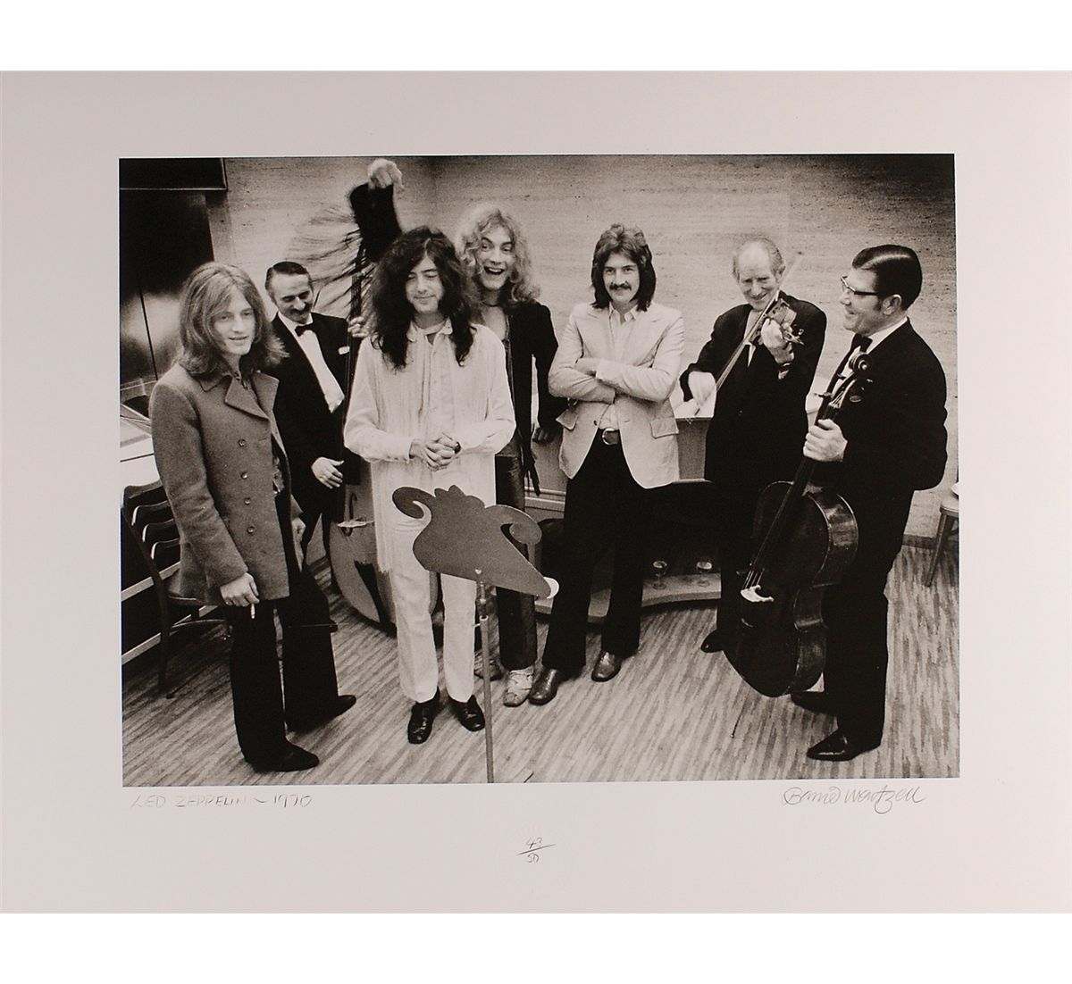 Limited edition close-up photo of Led Zeppelin posing with several orchestra musicians in 1970 on a 20 x 16 sheet of Kodak’s highest quality Silver Gelatin paper, #43/50, signed in pencil along the bottom by Wentzell and also bearing an embossed Wentzell seal. In fine condition.
